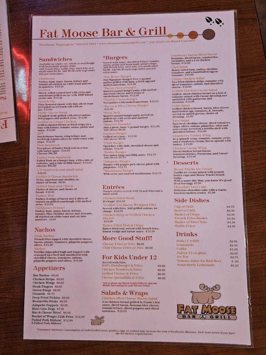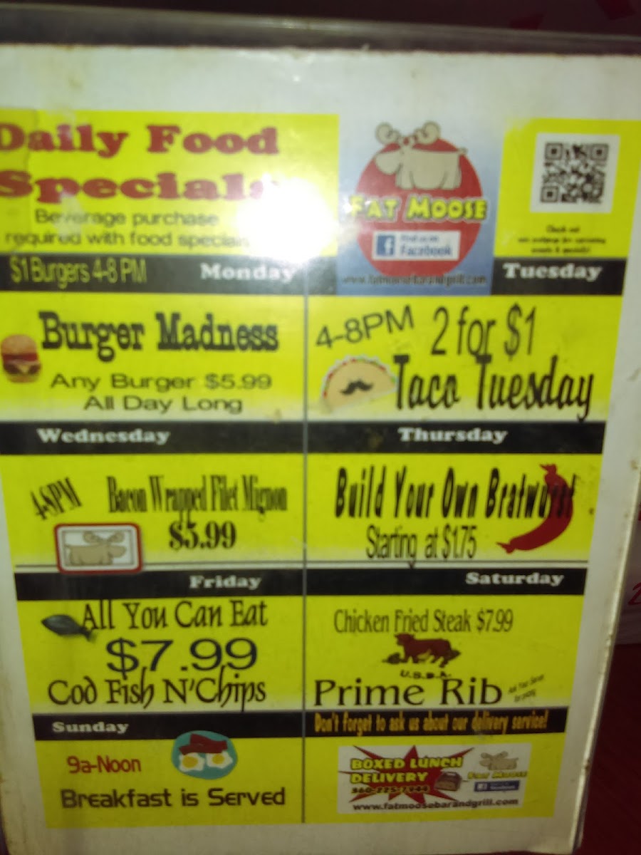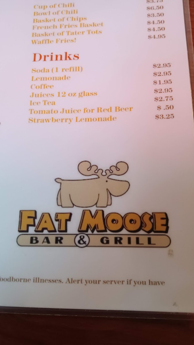 The menu at Fat Moose Bar & Grill reflects a laid-back, approachable bar and grill style, offering comforting, satisfying dishes that suit any time of day. Whether you're stopping in for a casual breakfast, a hearty lunch, or a relaxed evening meal, the menu features classic favorites alongside tempting bar bites and well-crafted drinks.